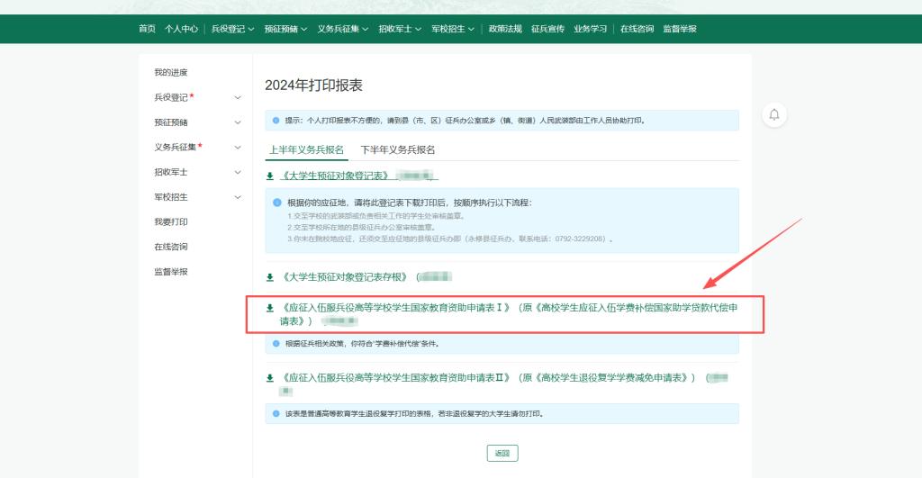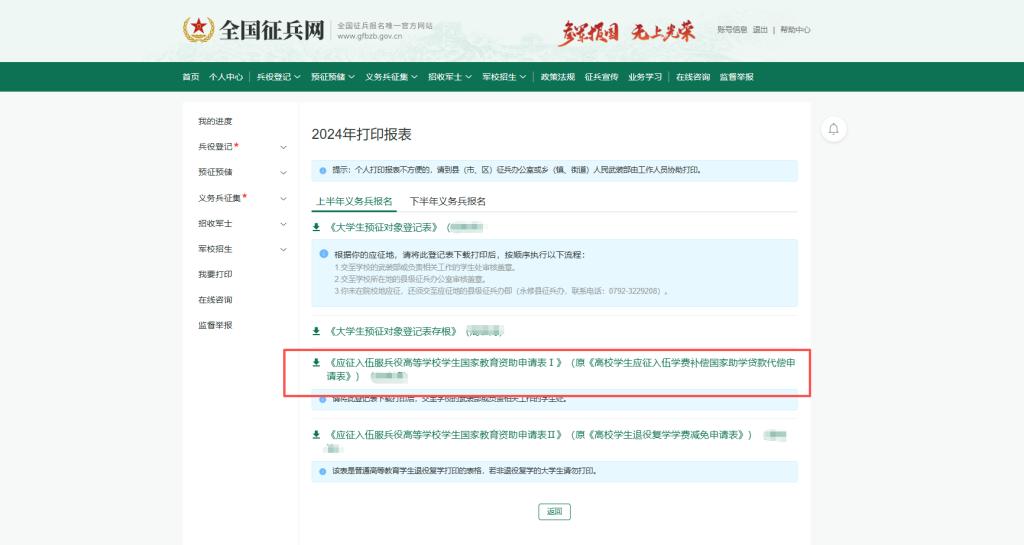 4.找到以下界面,点击并填写《应征入伍服兵役高等学校学生国家教育资助申请表Ⅰ》,(如未找到“打印报表”的同学,在我要打印界面右上角点击“往年报名信息--往年报表打印”)